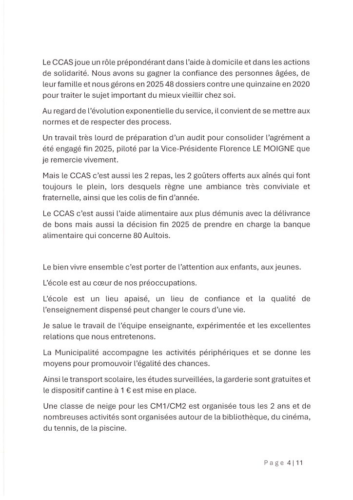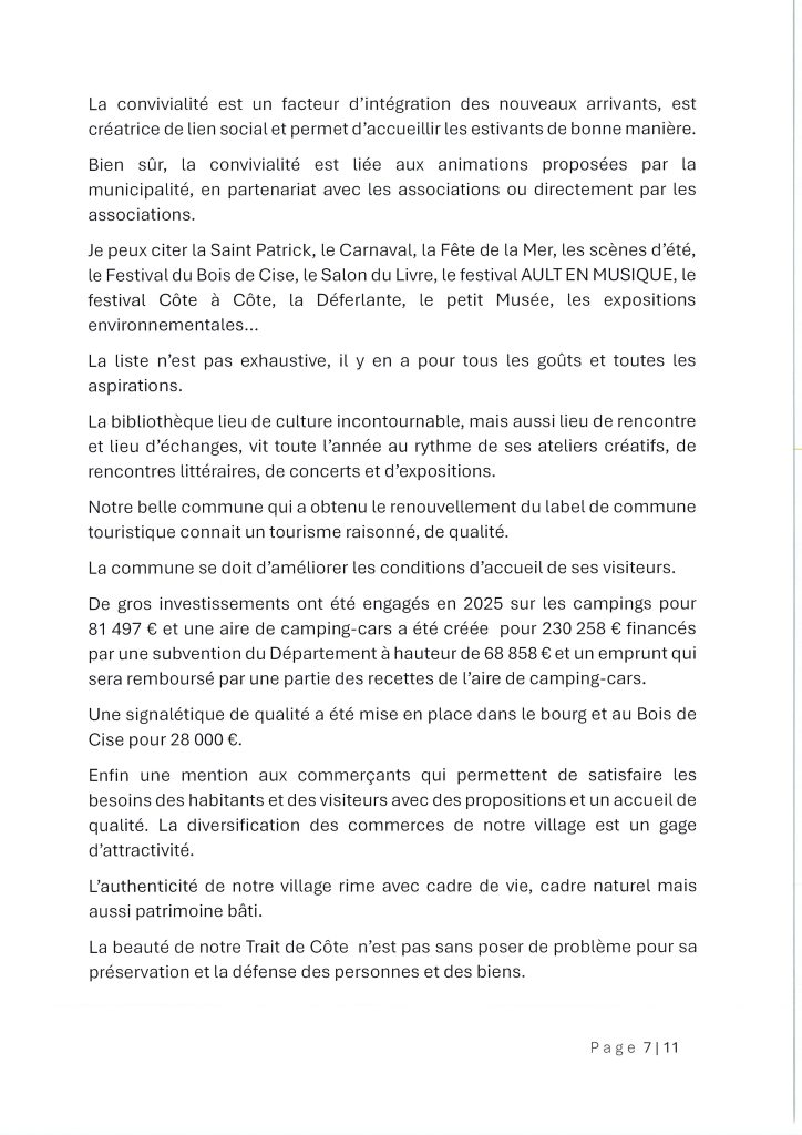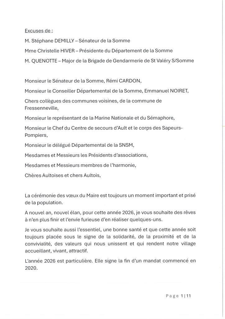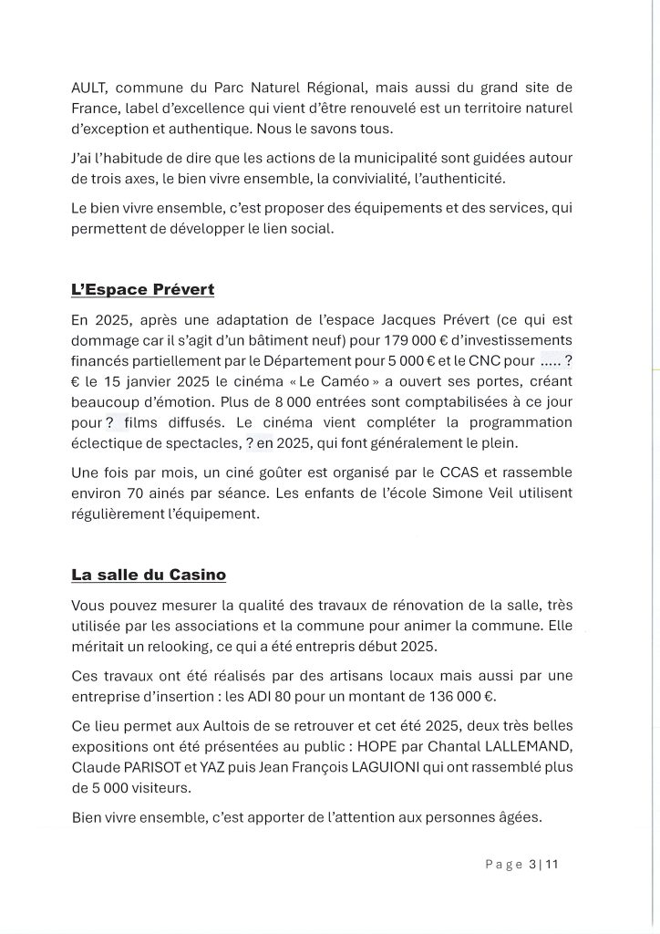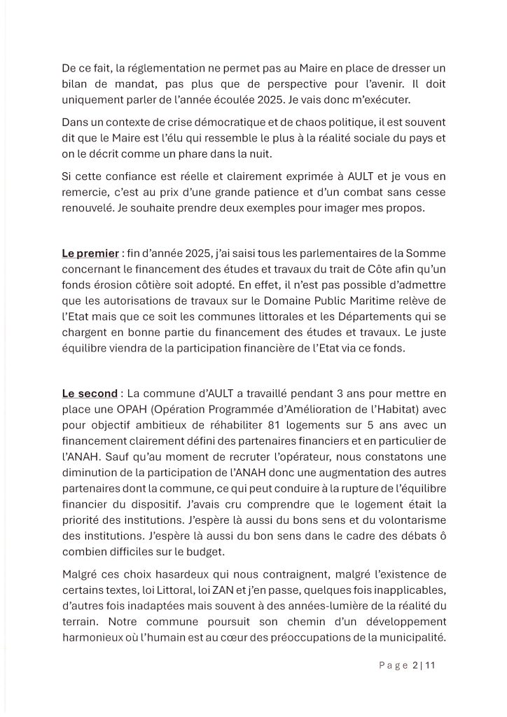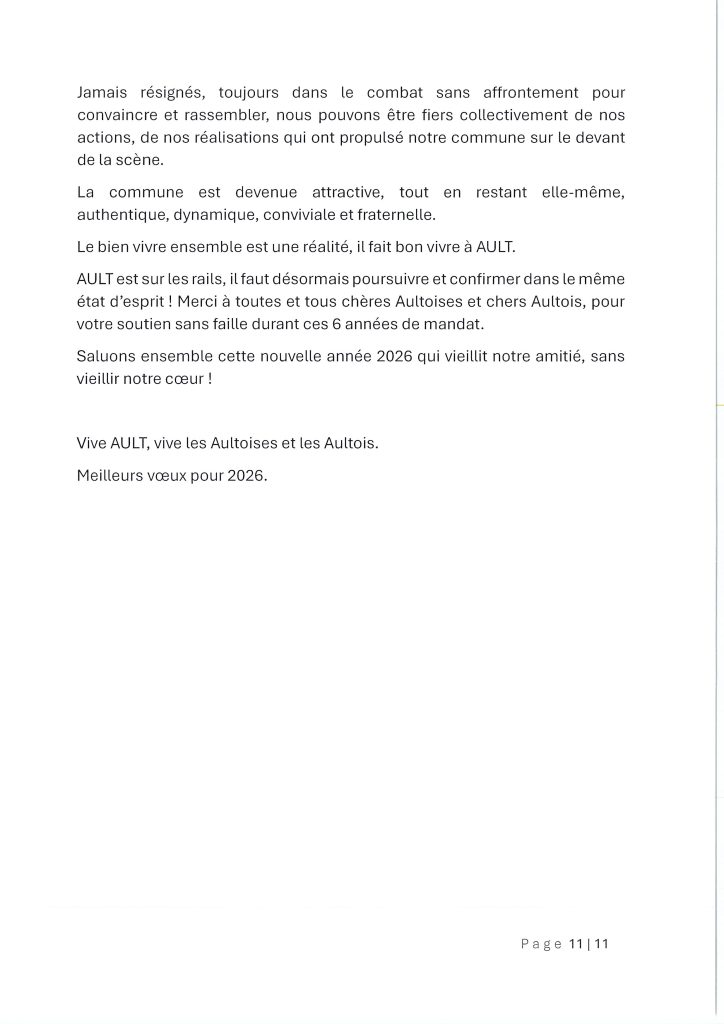 Conclusion : L’année 2026 s’ouvre sur de nouvelles perspectives, notamment avec le projet de résidence seniors sur le site de l’ancienne école. La municipalité remercie chaleureusement les agents, les associations et les bénévoles qui font vivre Ault au quotidien.