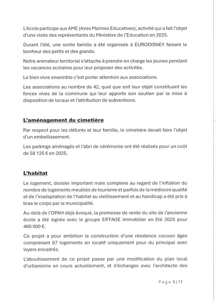 Une gestion financière maîtrisée Malgré un contexte national difficile et des combats à mener pour obtenir des financements (notamment pour le trait de côte et l’habitat), la commune a investi près de 18 millions d’euros sur la période 2020-2026. Fait notable pour les habitants : ces investissements ont été réalisés tout en baissant la taxe foncière de 3,04 points, sans augmenter la taxe d’habitation des résidences secondaires.