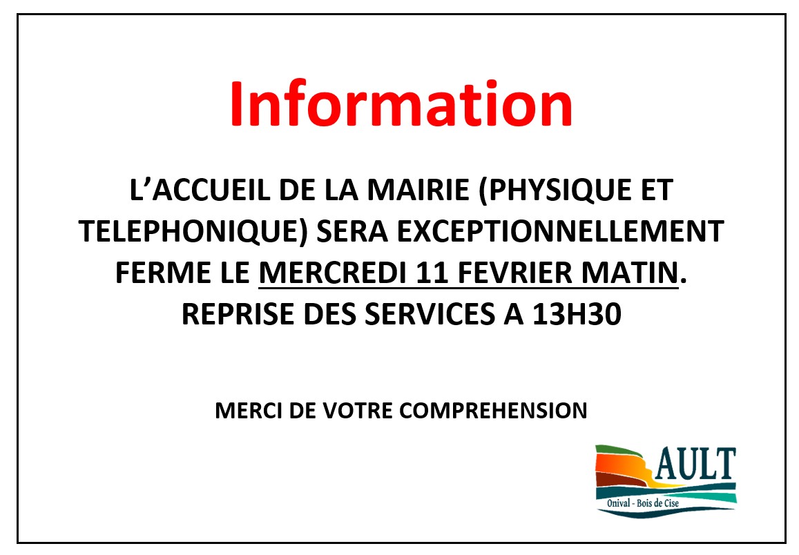 Chères Aultoises, chers Aultois, Veuillez noter que la Mairie fermera exceptionnellement ses portes le matin du mercredi 11 février 2026. Nos services seront accessibles l’après