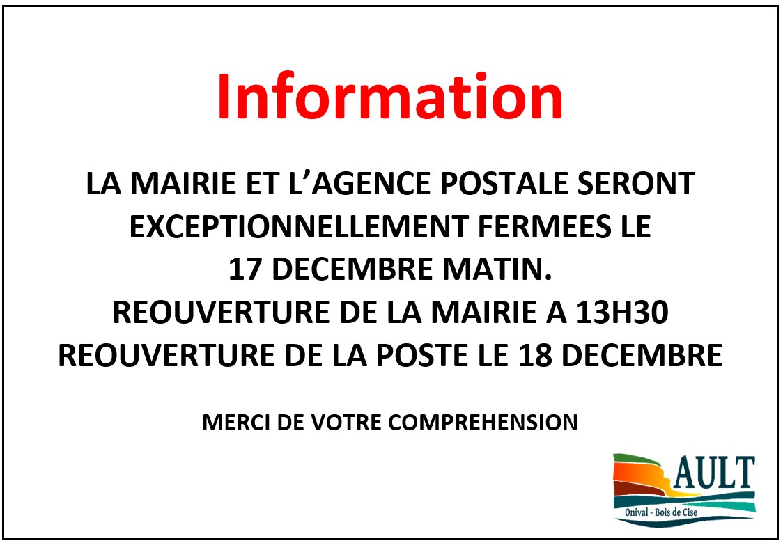 LA MAIRIE ET L’AGENCE POSTALE SERONT FERMÉES LE 17 DÉCEMBRE AU MATIN