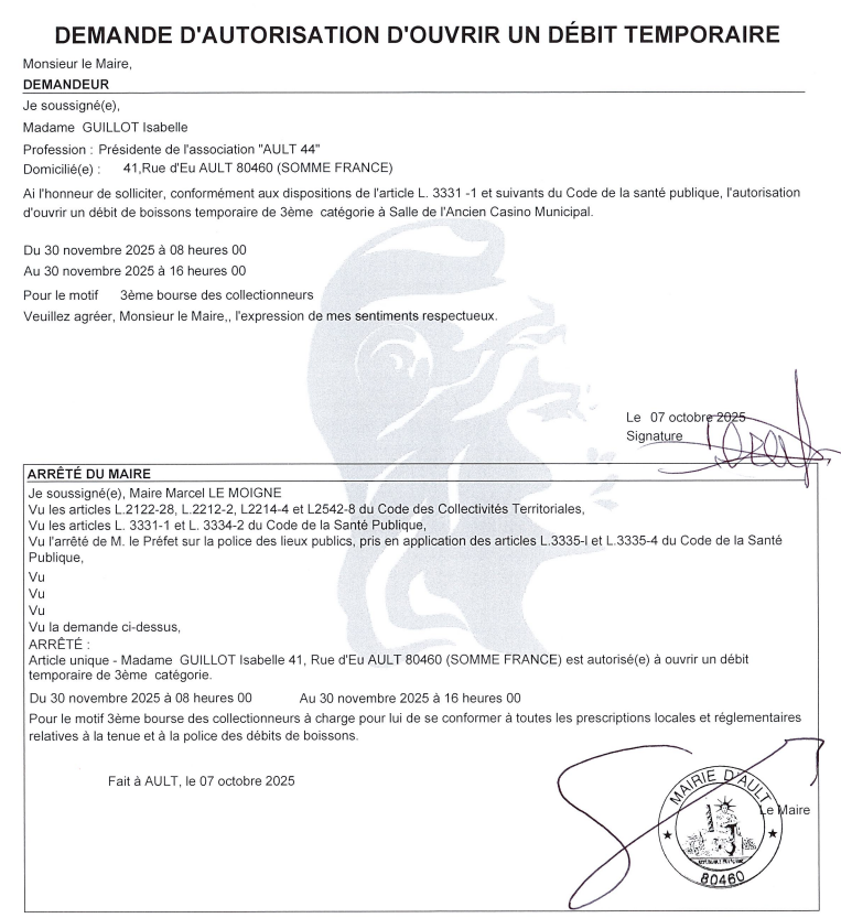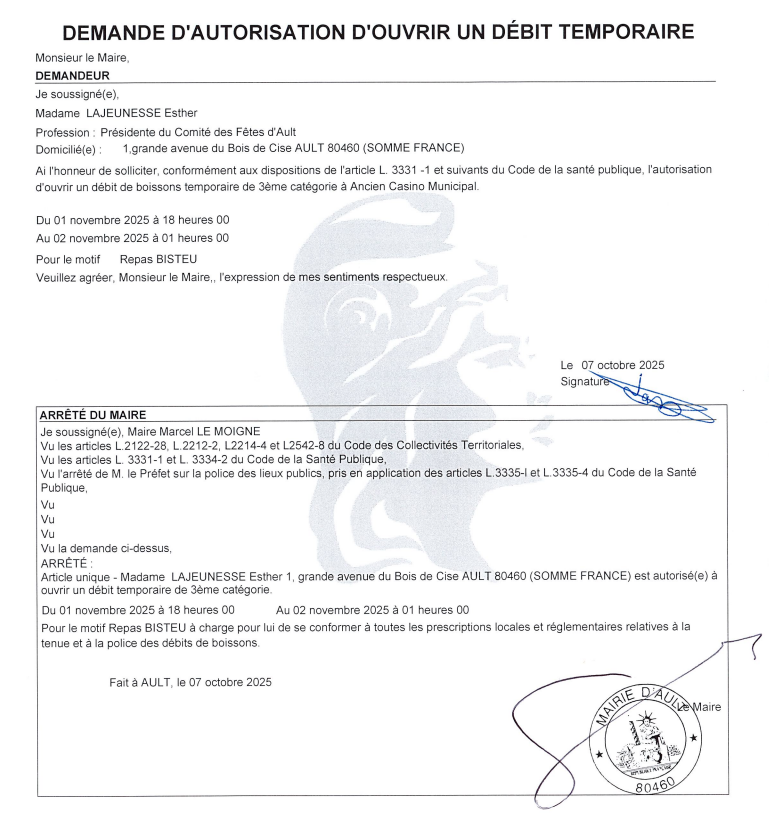 DEMANDE D'AUTORISATION DÉBIT DE BOISSONS du 7 octobre 2025 pour "Ault 44" le 30 novembre 2025