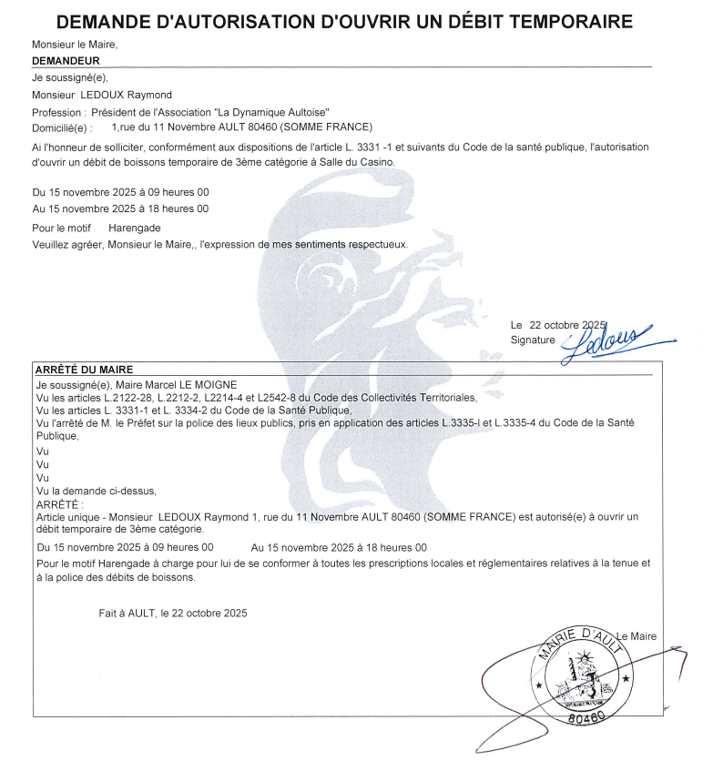 DEMANDE D'AUTORISATION DÉBIT DE BOISSONS du 22 octobre 2025 pour "La Dynamique Aultoise" le 15 novembre 2025