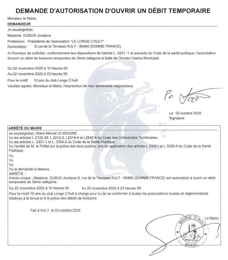 DEMANDE D'AUTORISATION DÉBIT DE BOISSONS du 3 octobre 2025 pour "LE LONGE C'AULT" le 22 novembre 2025