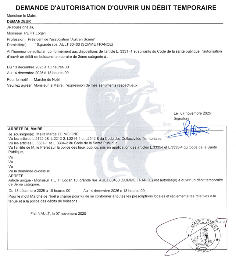 DEMANDE D'AUTORISATION DÉBIT DE BOISSONS du 07 novembre 2025 pour "Ault en scène" le 13 et 14 décembre 2025