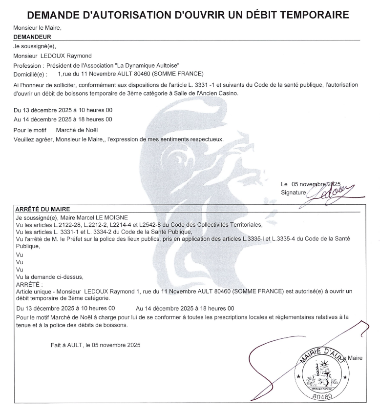DEMANDE D'AUTORISATION DÉBIT DE BOISSONS du 05 novembre 2025 pour "La Dynamique Aultoise" le 13 et 14 décembre 2025