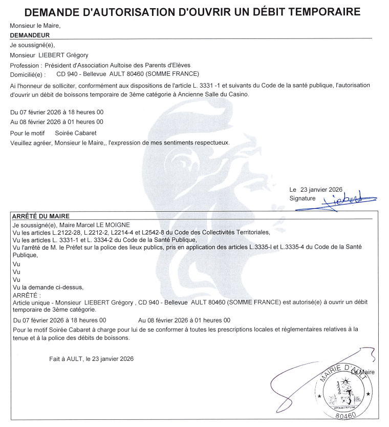DEMANDE D'AUTORISATION DÉBIT DE BOISSONS du 23 janvier 2026 pour l'association "Association Aultoise des Parents d'élèves"