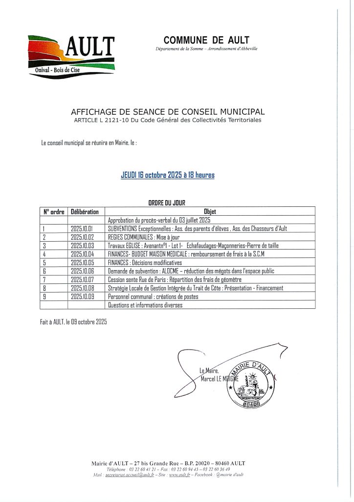 RÉUNION DU CONSEIL MUNICIPAL LE JEUDI 16 OCTOBRE 2025 A 18 H 00